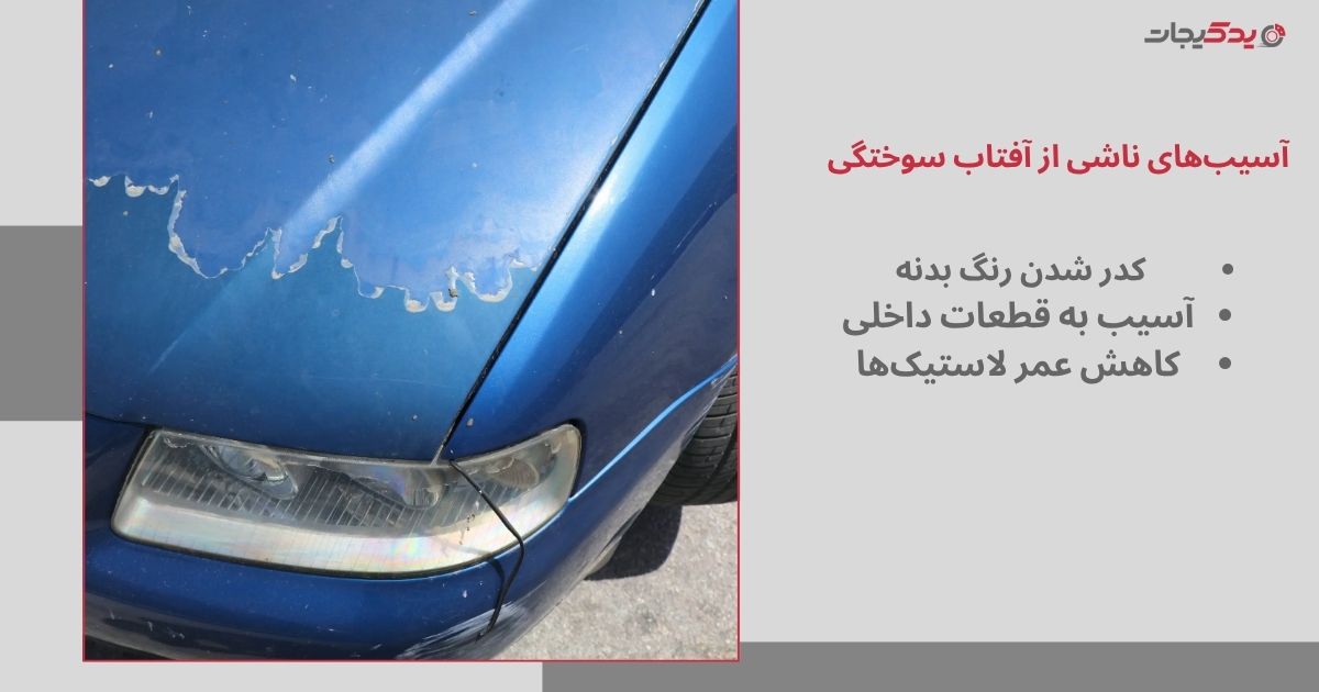 نور مستقیم خورشید روی زیبایی خودرو تأثیر میگذارد و میتواند مشکلات جدیتری را به همراه داشته باشد. برخی از این آسیبها عبارتاند از: