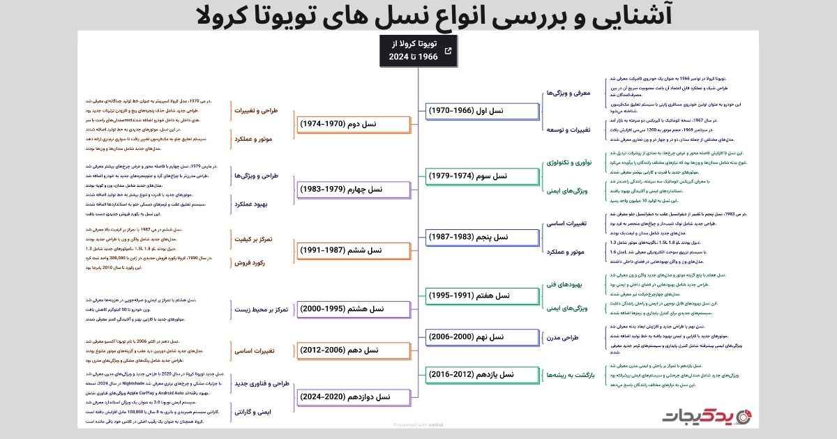 در ادامه، بهصورت خلاصه با ویژگیهای هر نسل آشنا میشویم و نگاهی به مسیر پیشرفت انواع تویوتا کرولا میاندازیم: