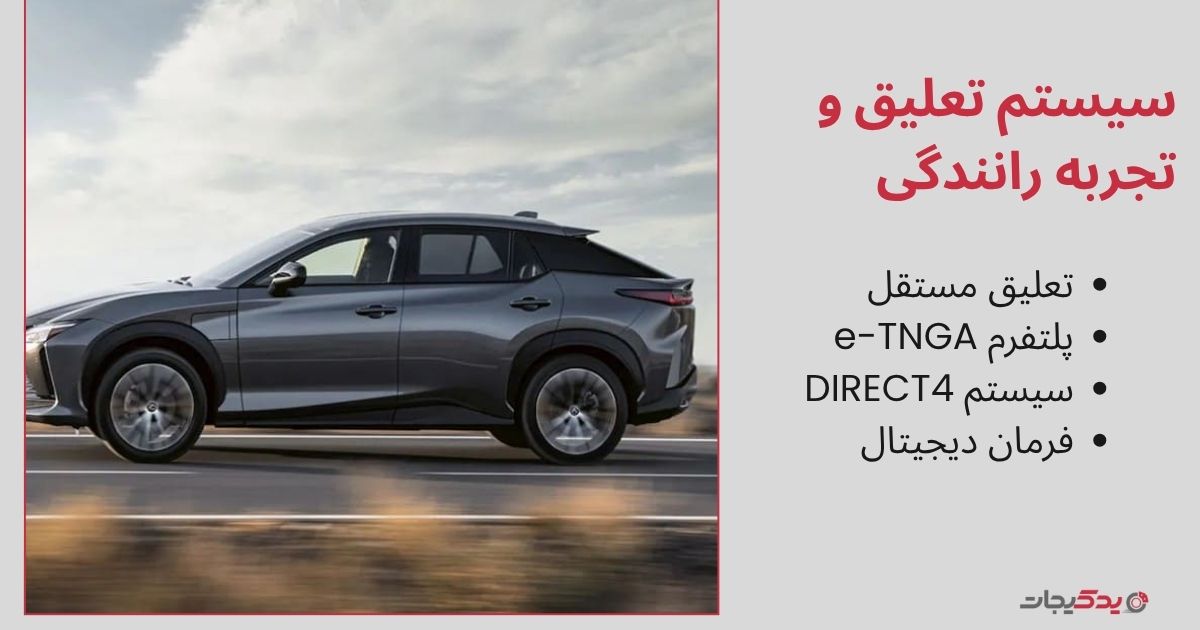 در بررسی فنی لکسوس RZ ۲۰۲۵، یکی از ویژگیهای بارز این مدل، استفاده از پلتفرم اختصاصی e-TNGA است؛ پلتفرمی که مخصوص خودروهای برقی طراحی شده و با توزیع متعادل وزن و کاهش مرکز ثقل، نقش مهمی در بهبود عملکرد خودرو دارد. این طراحی باعث میشود RZ در پیچها پایدارتر حرکت کند، در سرعتهای بالا کنترل بهتری داشته باشد و سواریای ایمنتر و راحتتر برای سرنشینان فراهم کند. برای مطالعه بیشتر پیشنهاد میشود مطلب پلتفرم TNGA تویوتا: مهندسی پیشرفته برای ایمنی و عملکرد بهتر