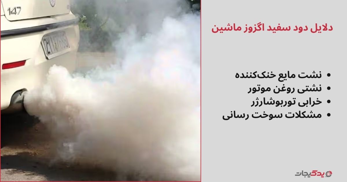 دود سفید اگزوز ماشین معمولاً به دلیل تراکم رطوبت (در هوای سرد)، نشت مایع خنک‌کننده به دلیل خرابی واشر سرسیلندر، یا مشکلات سیستم سوخت‌رسانی است. اگر دود مداوم یا همراه با بوی شیرین است، فوراً خودرو را به مکانیک نشان دهید.
